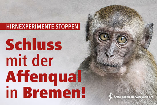 Unser Ärzteverein kritisiert diese Versuche seit vielen Jahren als besonders qualvoll und nutzlos für kranke Menschen. Neben der ethischen Nichtvertretbarkeit, sehen wir auch vor dem Hintergrund des aufgrund von EU-Recht geänderten Tierschutzgesetzes keine Grundlage für die erneute Genehmigung. Mit groß angelegten Plakataktionen in Bremen im September 2021, Juli 2022 und September 2023 prangerte unser Verein gemeinsam mit der Deutschen Juristischen Gesellschaft für Tierschutzrecht (DJGT) die Affenhirnversuche an und fordert deren Ende.