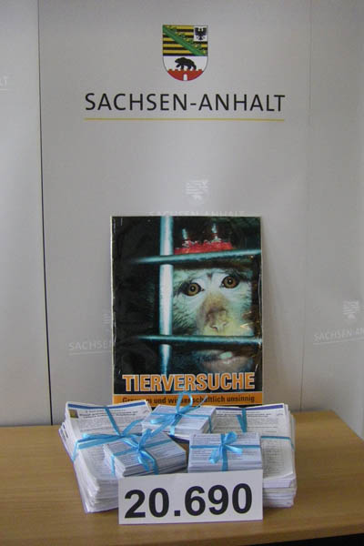 Mit der Forderung der Abschaffung der grausamen Tierversuche am Magdeburger Leibniz-Institut überreichte der bundesweite Verein Ärzte gegen Tierversuche mit Unterstützung von Undine Kurth MdB heute dem Landwirtschaftsminister von Sachsen-Anhalt, Hermann Onko Aeikens, 20.690 Unterschriften von Bürgern, die eine ethische Forschung ohne Tierleid wollen.
