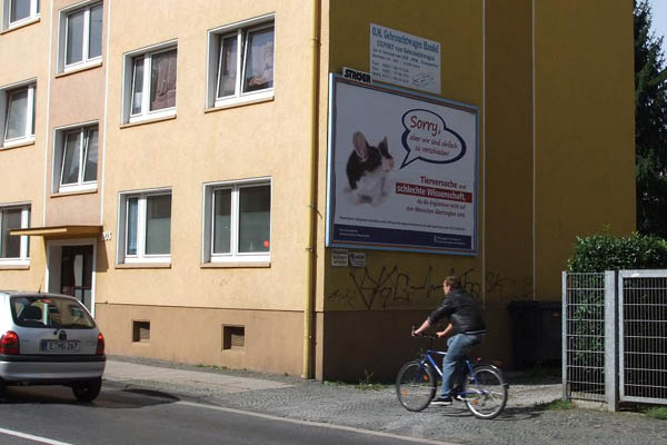 Das Motiv soll zum Nachdenken anregen. »Viele Menschen glauben immer noch, dass es ohne Tierversuche keine Medizin gäbe«, sagt Dr. med. vet. Corina Gericke, Vorstandsmitglied von Ärzte gegen Tierversuche. »Das ist ein Trugschluss. Im Gegenteil, Tierversuche sind wegen der mangelnden Übertragbarkeit der Ergebnisse nicht nur der falsche Weg, um menschliche Krankheiten zu behandeln und zu heilen, sie verhindern sogar medizinischen Fortschritt. Viele segensreiche Arzneien wie Aspirin, Ibuprofen, Insulin, Penicillin oder Phenobarbital wären uns vorenthalten geblieben, hätte man sich schon in früheren Zeiten auf den Tierversuch verlassen. Diese Stoffe rufen nämlich bei verschiedenen Tierarten aufgrund unterschiedlicher Stoffwechselvorgänge gravierende Schädigungen hervor. Sie wären bei der heutigen Vorgehensweise der Wirkstofffindung glatt durchgefallen«, erläutert Tierärztin Gericke. Nach Ansicht des Ärztevereins sollten die Milliarden Steuergelder, die in die tierexperimentelle Forschung fließen, für tierversuchsfreie Forschung, beispielsweise mit Zellkulturen und Mikrochips sowie die Prävention von Krankheiten, ausgegeben werden. »Nur so käme die Medizin aus der Sackgasse heraus, in die der Tierversuch sie geführt hat«, ist sich Gericke sicher.