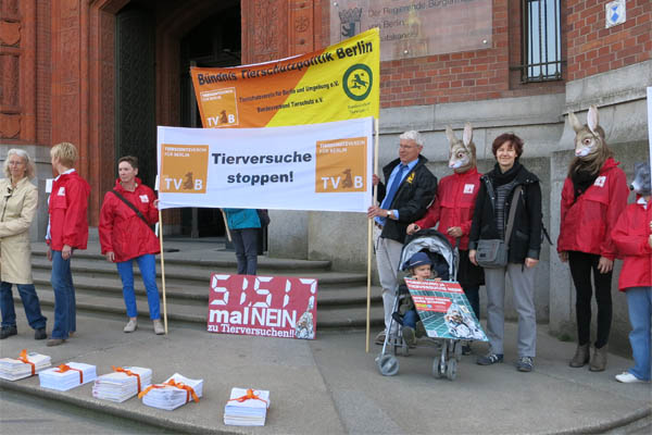 Am 24.4.2015, dem Internationalen Tag zur Abschaffung der Tierversuche, hat um 11 Uhr das Bündnis Tierschutzpolitik Berlin – bestehend aus dem Tierschutzverein für Berlin und dem Bundesverband Tierschutz – gemeinsam mit den Ärzten gegen Tierversuche insgesamt 51.517 Unterschriften gegen den Neubau der Tierversuchsanlage des Max-Delbrück-Centrums (MDC) an Thomas Ortmann als Vertreter des Regierenden Bürgermeisters übergeben. Bereits vor einem Jahr haben wir zusammen mit den Tierversuchsgegnern Berlin und Brandenburg e.V. 54.697 Unterschriften überreicht, so dass unsere Vereine insgesamt über 100.000 Unterschriften gegen das Neubauvorhaben vorlegen können.