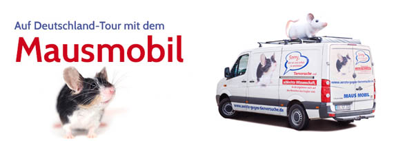 Das „Mausmobil“ ist ein Transporter mit auflackierter Botschaft, Maus „Bertha“ als Hingucker auf dem Dach, einem großen Bildschirm im Heck und einem Infostand daneben. Dadurch können wir unsere Argumente gegen Tierversuche und für eine tierversuchsfreie Forschung direkt vor Ort, von Mensch zu Mensch näherbringen und einer größeren Öffentlichkeit zugänglich machen.