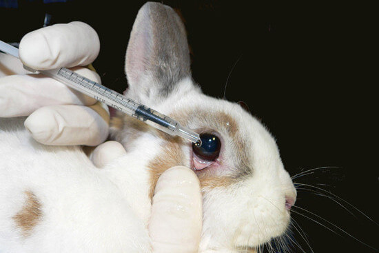 Tierversuch: Die Testsubstanz wird Kaninchen in die Augen geträufelt. Anschließend werden die Schäden beobachtet: Je nach Art und Dosierung des Stoffes kommt es zu schmerzhaften Entzündungen und schweren Verätzungen des Auges.
