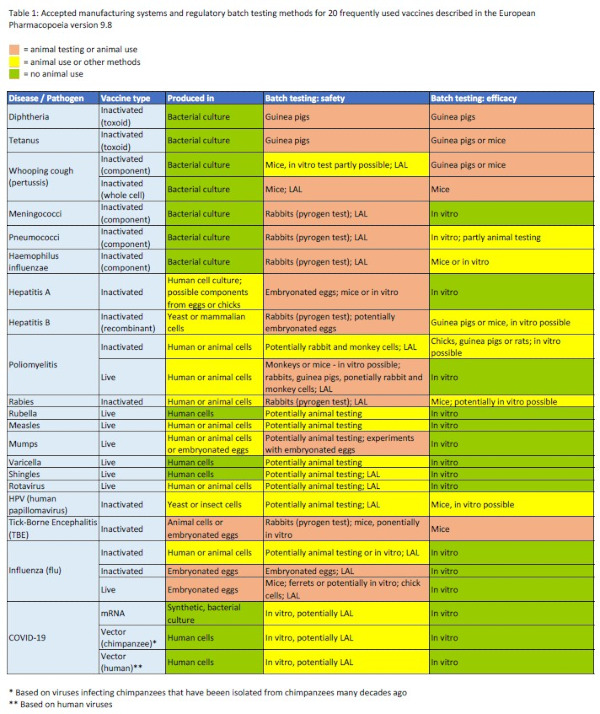 Table 1 (see above) summarizes the animal tests required by the European Pharmacopoeia for each of the 20 most common vaccines (16).