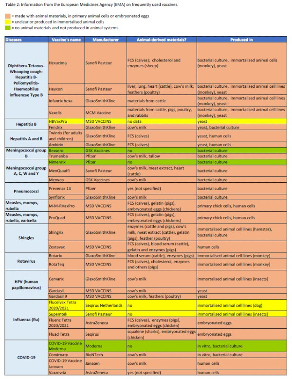 Table 2: Information from the European Medicines Agency (EMA) on the use of animal cells, embryonated eggs,or other animal materials for commonly used vaccines.