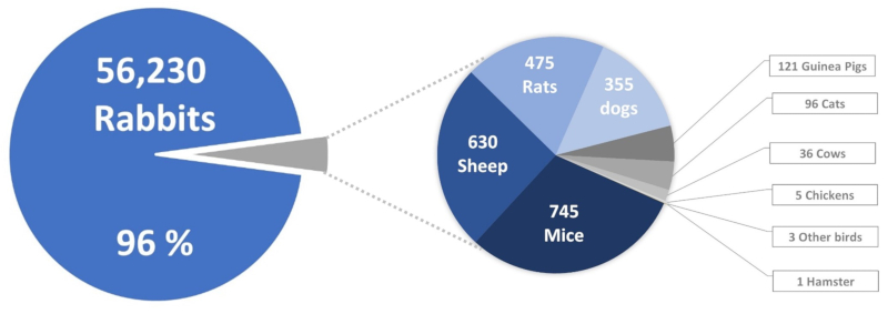 58,699 animals were used in Germany for the production of blood-based products, which include sera and polyclonal antibodies, in 2020. 96% of these were rabbits. In addition, 2,469 other animals, among them mainly mice, sheep, rats, and dogs, had to suffer for the manufacture of these products. (3)
