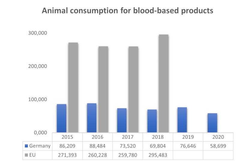 From 2015 to 2018, between 260,000 and 295,000 animals per year were used for the production of blood-based products in the EU (the figures for 2019 and 2020 are not yet available). German animal testing laboratories made a significant contribution to these figures (23 to 34%).