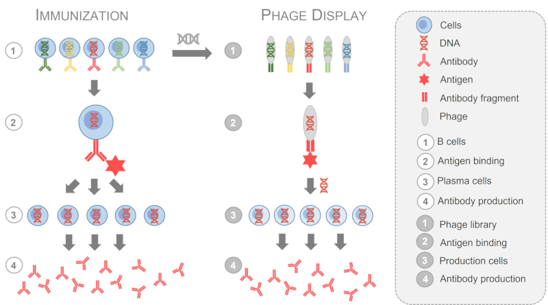 In this way, so-called phage libraries are accessible, in which each phage presents a different antibody fragment on its surface and at the same time contains the genetic information for the production of this specific antibody fragment. The antibody fragments that bind to a desired antigen can now be systematically selected from these libraries. In this selection process, the antibodies can already be adapted to their later application (see also Table 2). For example, specificity can be guided by performing counter-selections in which antibody fragments that bind to structures similar to the antigen are removed. In addition, it is possible to use already "pre-immunized" antibody libraries. For example, recovered COVID-19 patients have been used as donors to develop a phage library to obtain antibodies for COVID-19 therapy. (18)